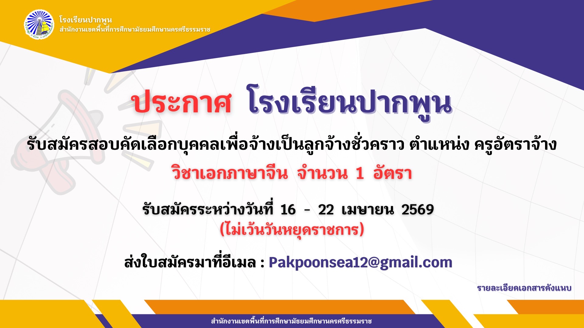 โรงเรียนปากพูน รับสมัครสอบคัดเลือกบุคคลเพื่อจ้างเป็นลูกจ้างชั่วคราว ตำแหน่ง ครูอัตราจ้างท วิชาเอกภาษาจีน จำนวน 1 อัตรา