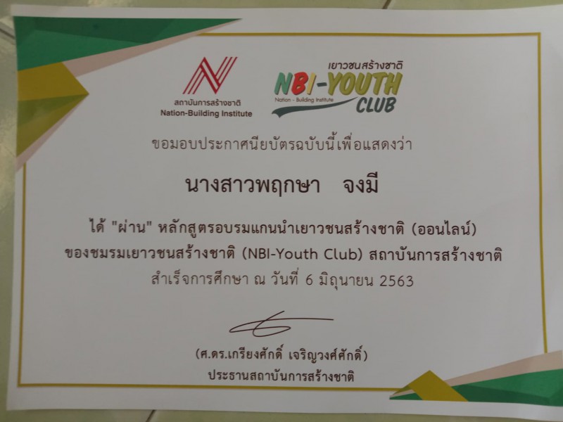 วันพุธที่ 24 มีนาคม 2564 นางสาวพฤกษา จงมี ได้รับประกาศนียบัตร เป็นผู้ผ่านอบรมหลักสูตรแกนนำเยาวชนสร้างชาติ (ออนไลน์) ของชมรมเยาวชนสร้างชาติ (NBI-Youth Club) สถาบันการสร้างชาติ โดยคุณตระการ พัฒนาไพบูลย์ จากหลักสูตรนักบริหารระดับสูงเพื่อการสร้างชาติ (นสช) สถาบันการสร้างชาติ ให้เกียรติมอบประกาศนียบัตรแก่นักเรียน |